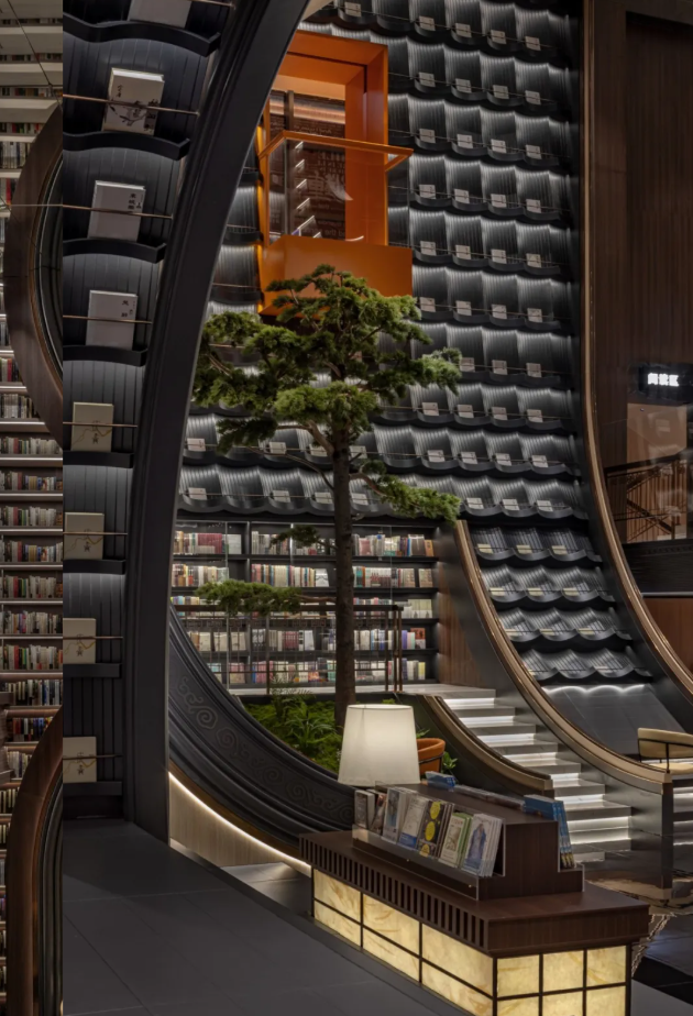 立体的屋檐、挺拔的书架、悬挂于房顶的几许灰色瓦片阵列,一起交错出“屋舍叠院·万家灯火”般的聚落感,既多维立体,又遥相照应。