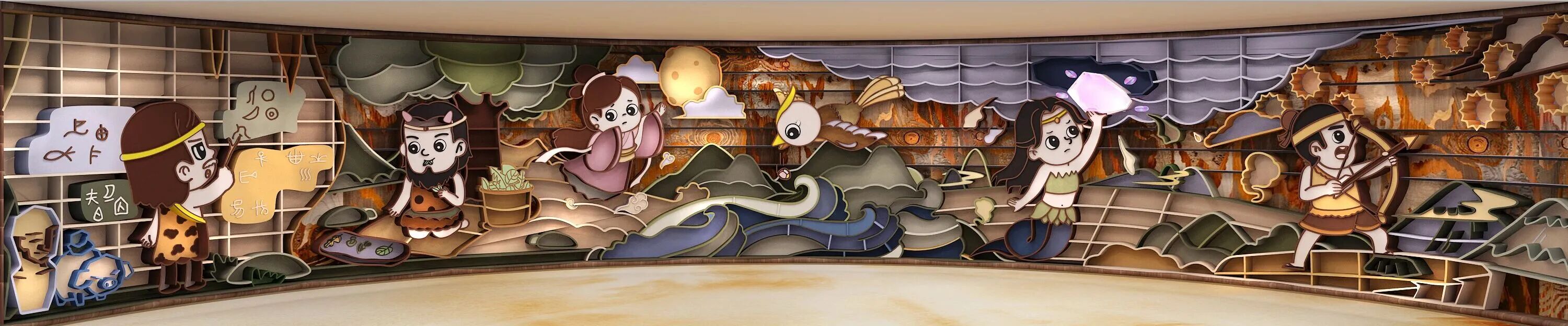 整个空间规划以大地色系为基底,调配朱红、靛蓝、藤黄等传统矿藏颜料颜色,让神话故事转化成可感知的教育场域。